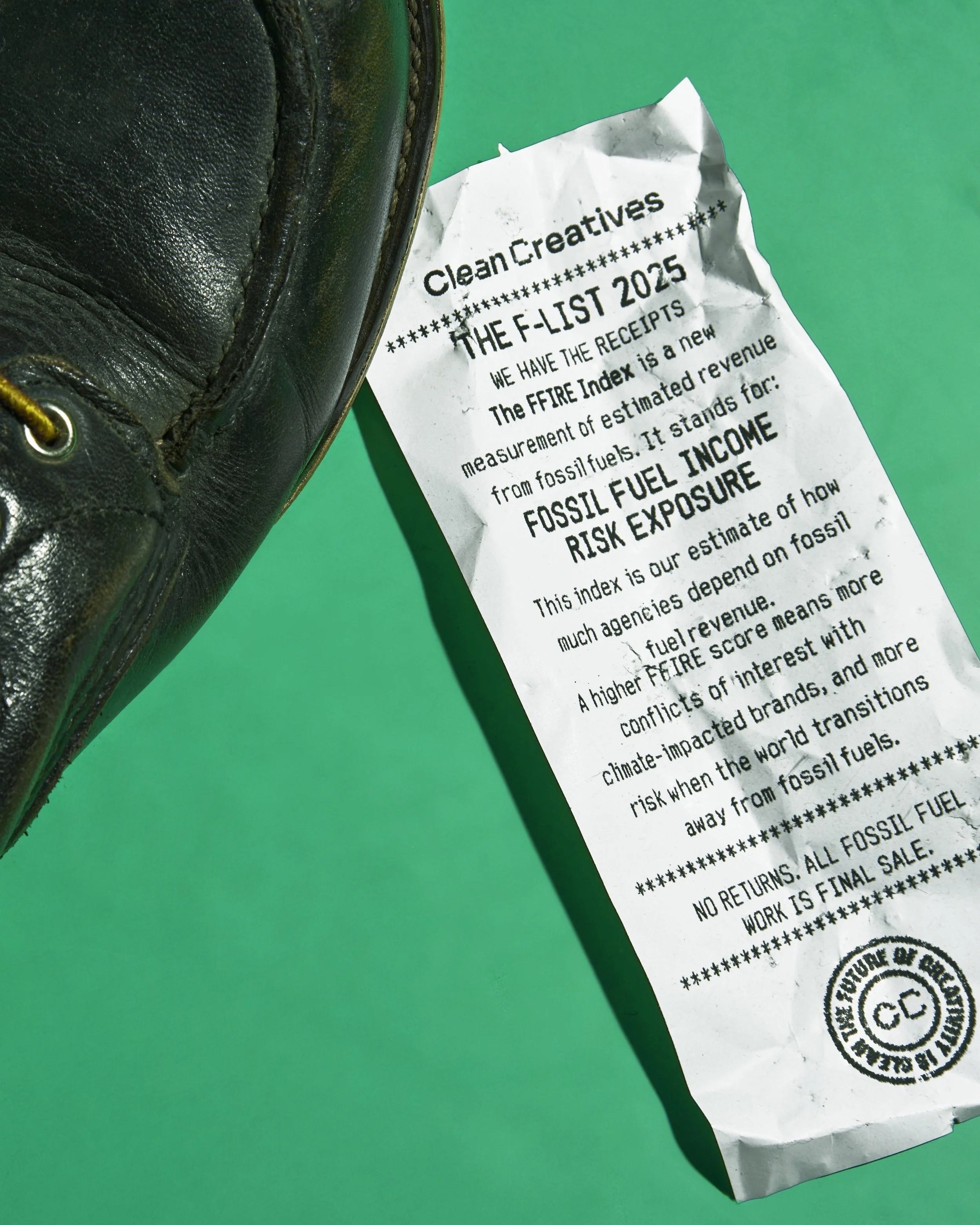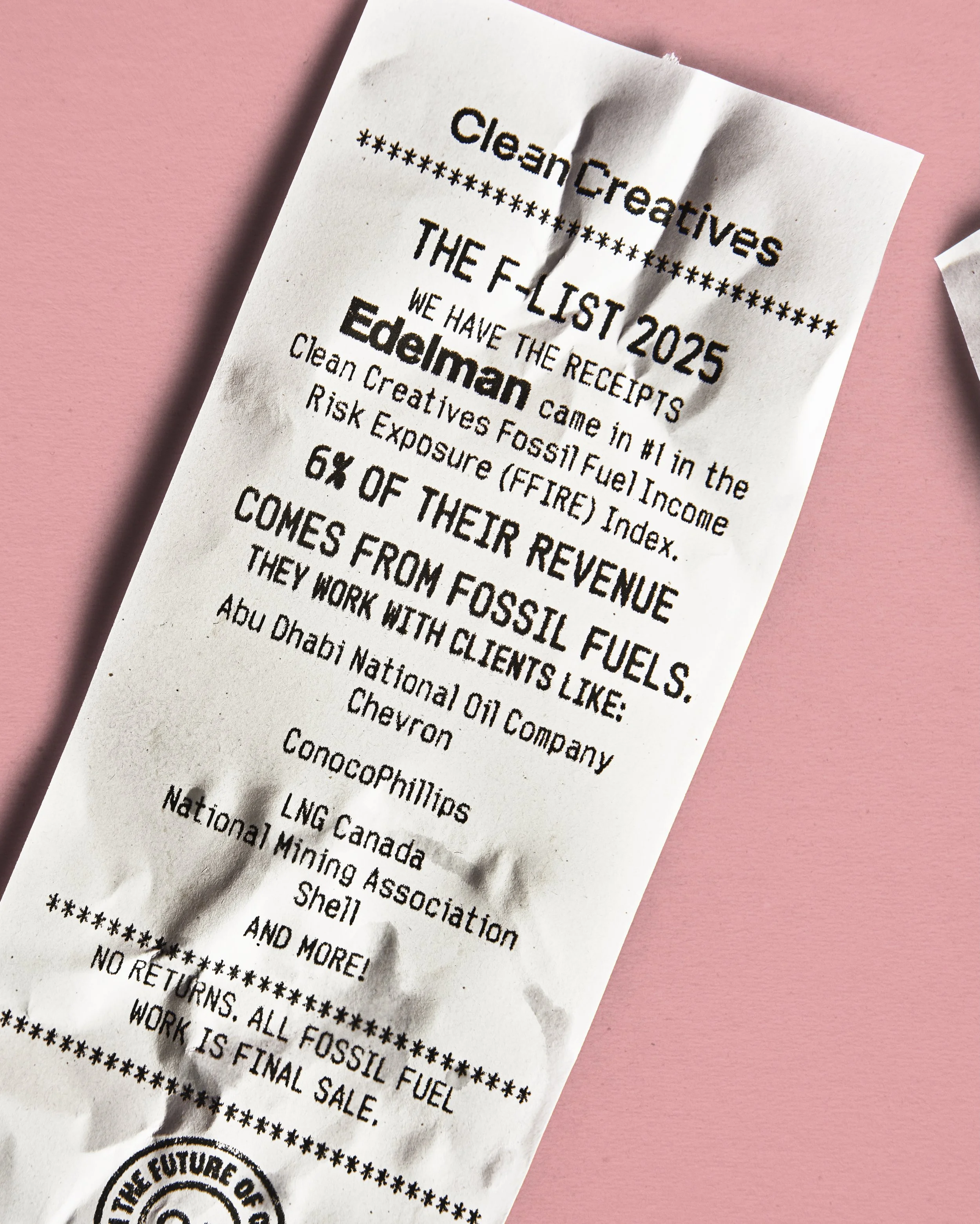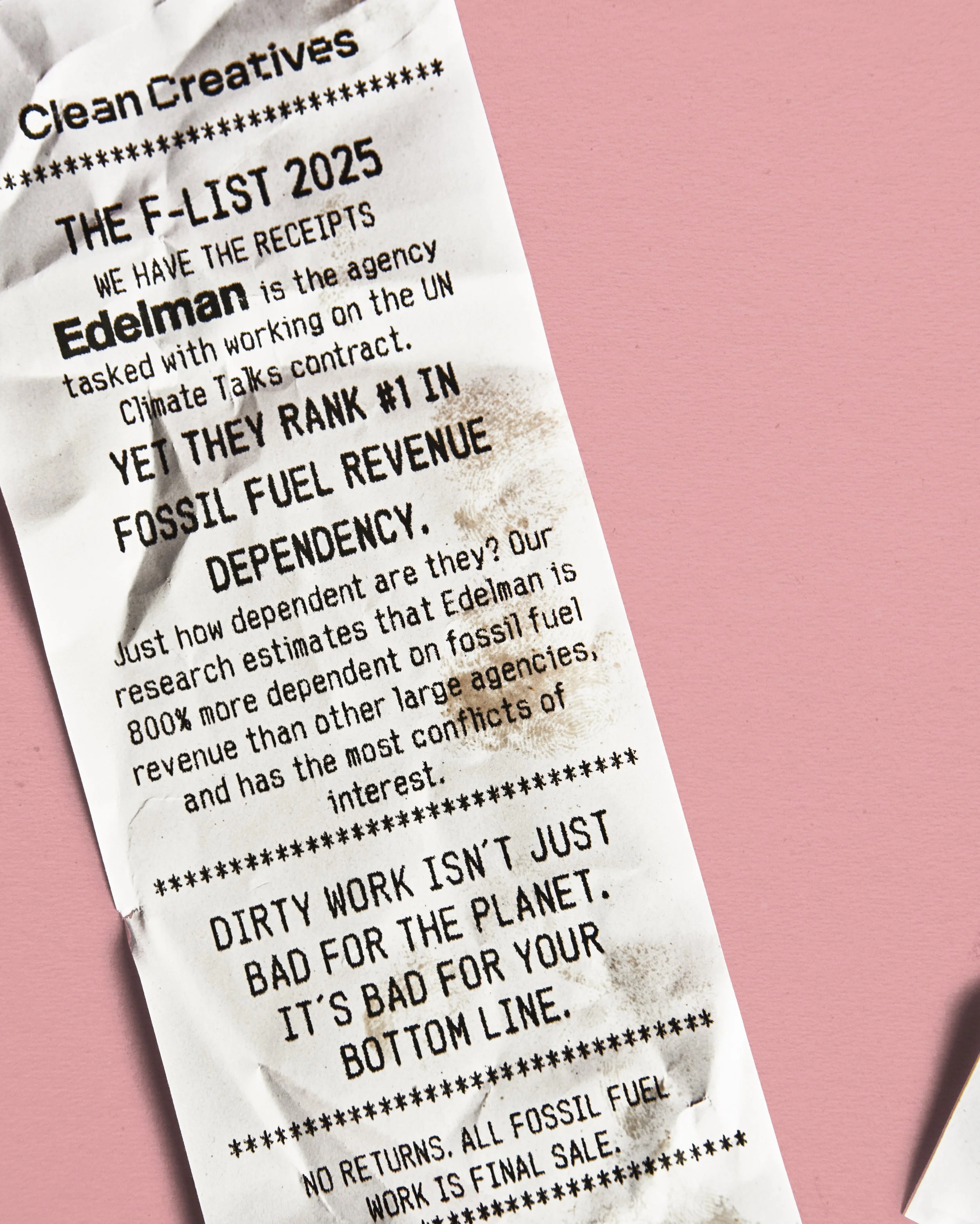 This year, Clean Creatives's annual report of fossil fuel contracts in the ad industry became a receipt roll: physical, itemized proof of fossil fuel work, with data that's even dirtier than the trash we dug it out of.