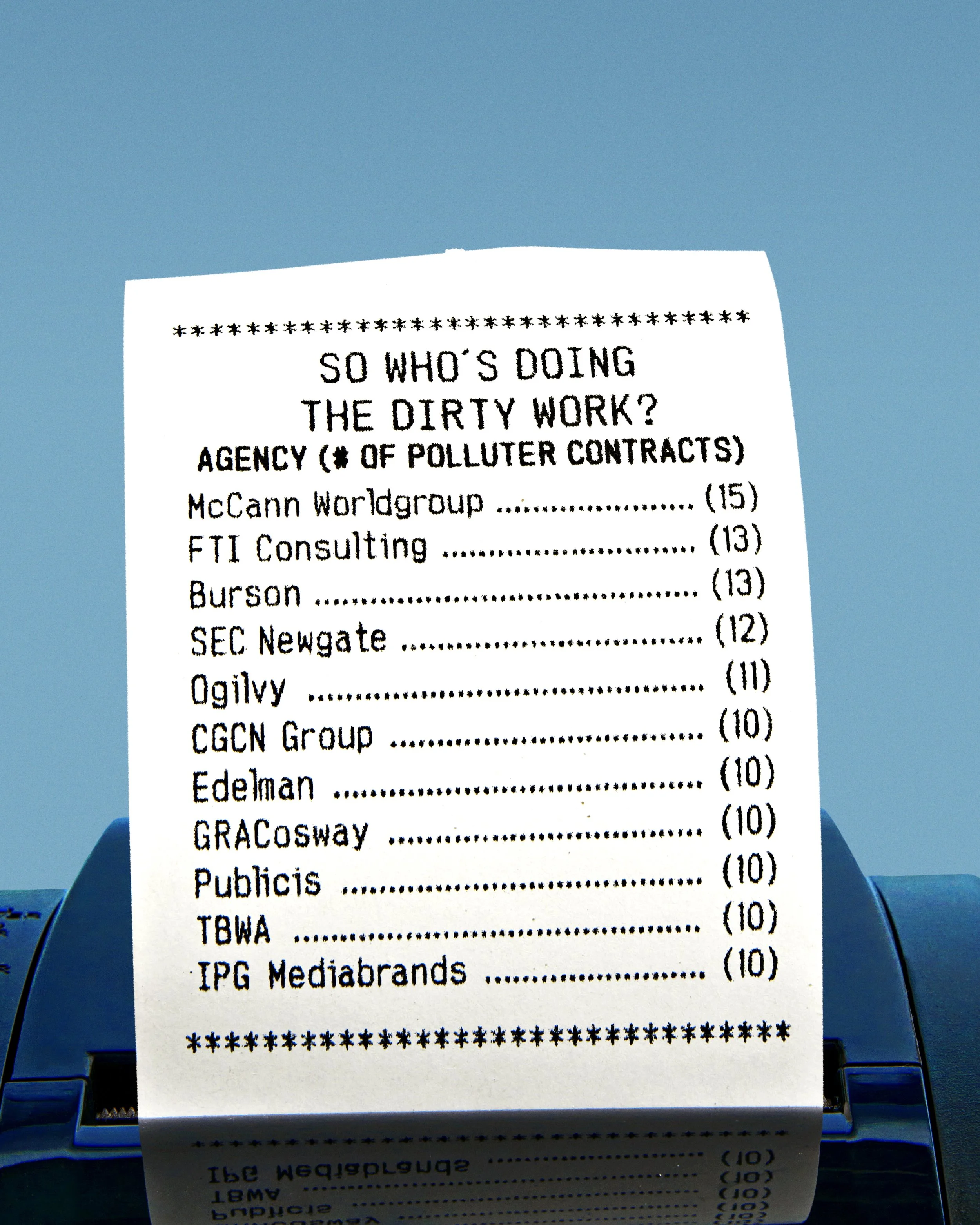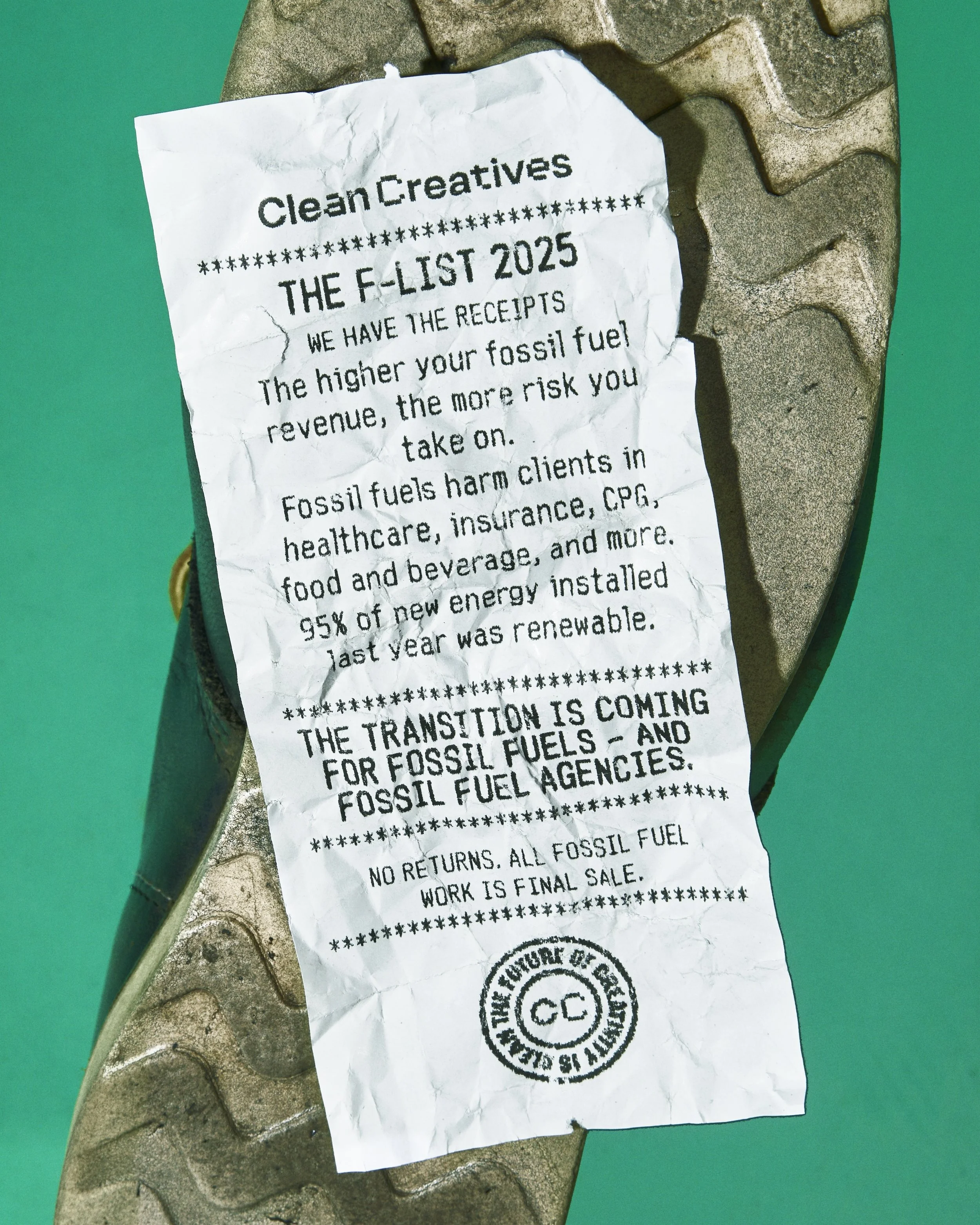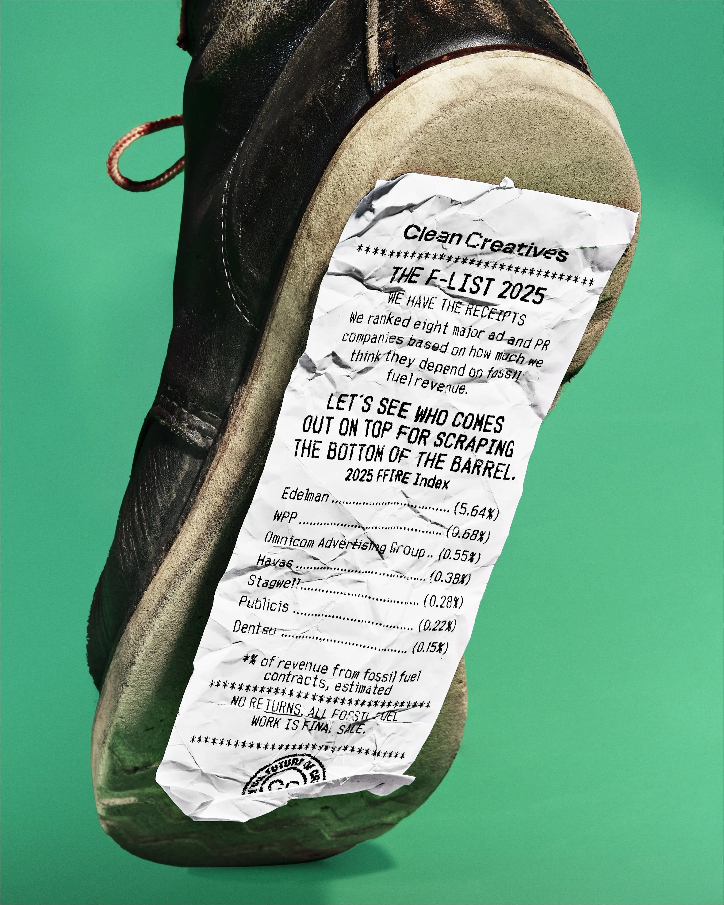 This year, Clean Creatives's annual report of fossil fuel contracts in the ad industry became a receipt roll: physical, itemized proof of fossil fuel work, with data that's even dirtier than the trash we dug it out of.